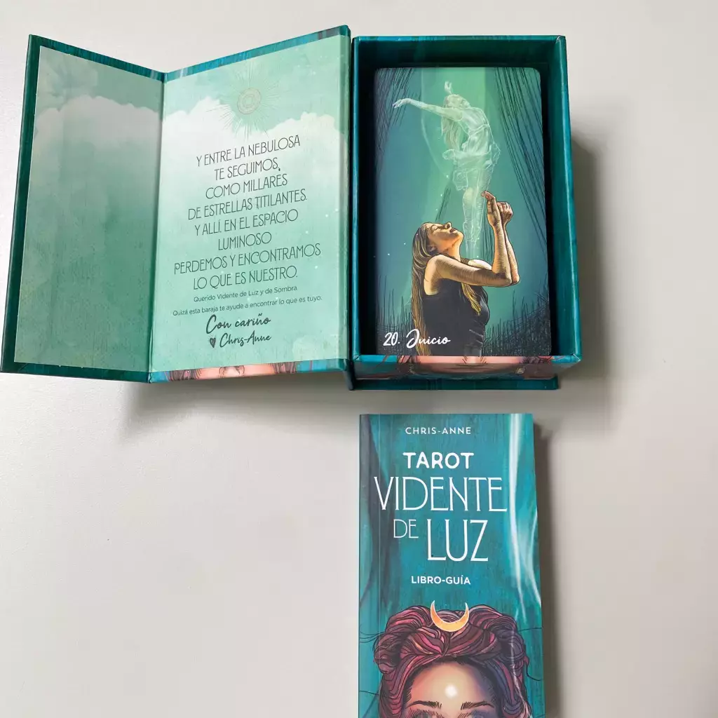 Esta baraja de tarot de 78 cartas es una herramienta de sanación y una guía para explorar las dos caras, la de la luz y la de la sombra, de nuestra naturaleza. Al concebir de nuevo los arquetipos y símbolos del tarot tradicional y mostrarlos en un estilo contemporáneo, bohemio e intuitivo, el Tarot Vidente de Luz muestra las dos caras, la de la luz y la de la sombra, de nuestra naturaleza y explora las lecciones que se pueden aprender de ambas. Los expresivos personajes que viven dentro de los paisajes de cada una de las cartas cuentan historias, hacen preguntas y brindan orientación. Esta baraja es un acompañamiento ideal en la búsqueda del descubrimiento de los espacios de tu vida, y de ti mismo, que necesitan mayor iluminación.
